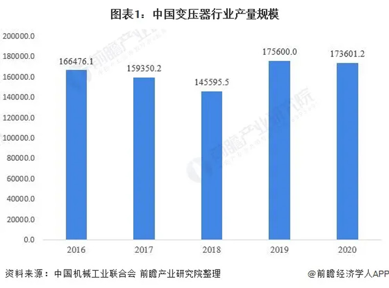 2016-2018年,受輸配電價格下降及產品浪費嚴重等問題的影響,隨著市場需求量的相對飽和及轉變變壓器產量小幅減少。2019年,我國變壓器總產量規(guī)模有所回升,整體規(guī)模達到175600萬千安伏,同比增長20.6%。2020年,受新冠疫情影響,我國變壓器總產量規(guī)模略微下降,降至173601.2萬千安伏,但較之前年份有所回升。